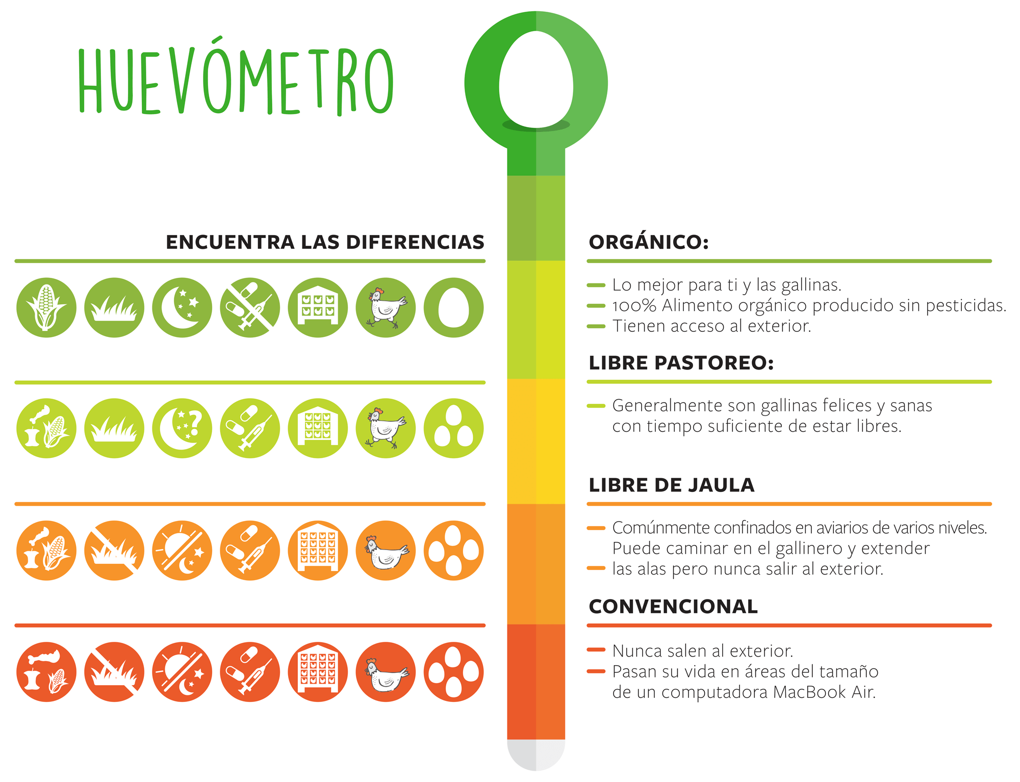 En nuestro huevómetro te mostramos las diferencias entre un huevo de libre pastoreo, orgánico certificado, libre de jaula y uno convencional: